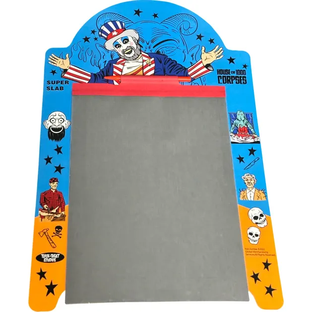 Howdy Folks! You like blood? Violence? Freaks of nature? Well, then boy do we have something for you! Trick or Treat Studios is thrilled to present the House of 1000 Corpses – Super Slab 3 Pack! Draw over and over again on the same piece of paper on these reusable doodle-pads. When you’re ready to erase your drawing or notes – just peel back the plastic sheet to erase for a blank slab once again! This is the perfect nostalgic activity for any fan!