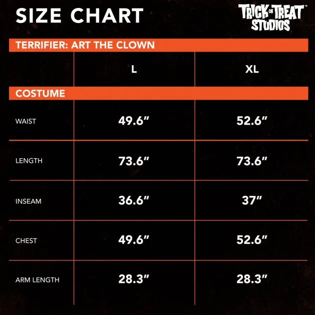 Trick or Treat Studios is proud to present the officially licensed, Terrifier – Art the Clown Costume! This amazing costume was developed by taking the screen used costume, kindly loaned to us by Dark Age, and sending it to our factories for one-to-one replication. Every detail of Art the Clown’s costume is represented in this incredible replica. Costume is one size fits most, please see size chart in product images before ordering. Order your Terrifier – Art the Clown Costume and our Terrifier Art the Clown mask and terrify your neighborhood this Halloween!